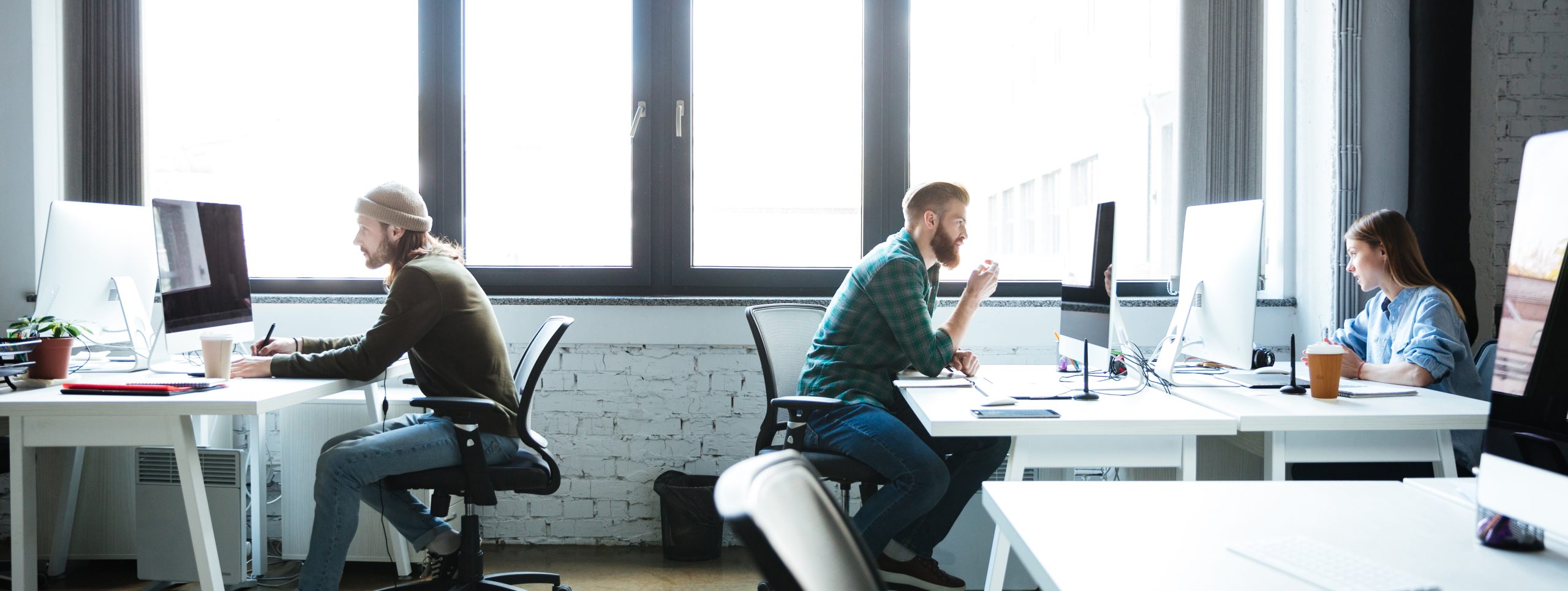 Home  »  Picture of young colleagues work in office using computers. Looking aside.