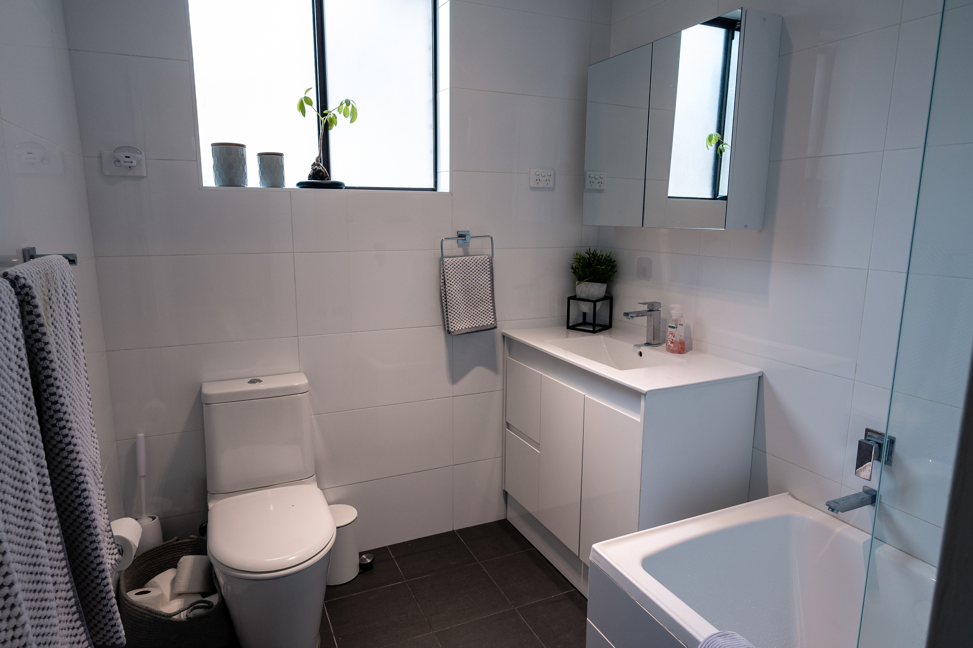 – Modern bathroom with bath/shower