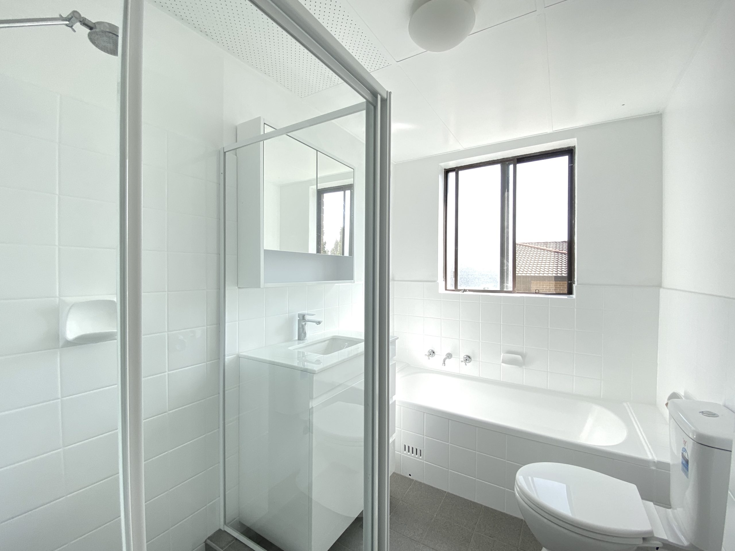 – Renovated bathroom with separate bath and shower
