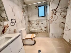 This image shows a contemporary bathroom at 477A Princes Hwy (Enter via Dwyer lane),, Blakehurst NSW 2221, featuring marble-look wall tiling, a glass-enclosed shower with framed screen, tiled flooring, a modern vanity with basin, toilet, and a frosted window providing natural light and ventilation.