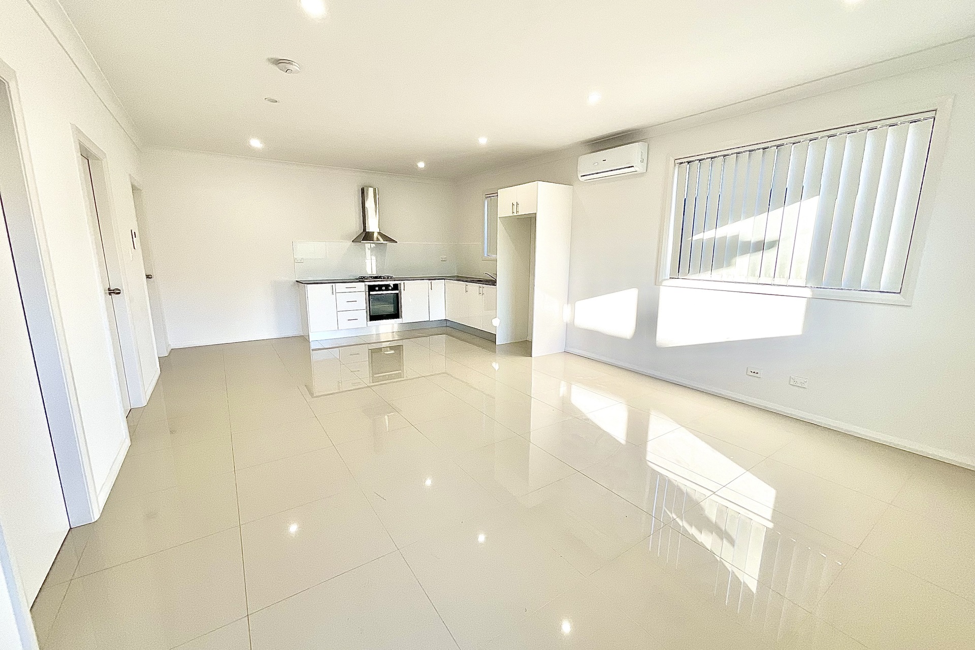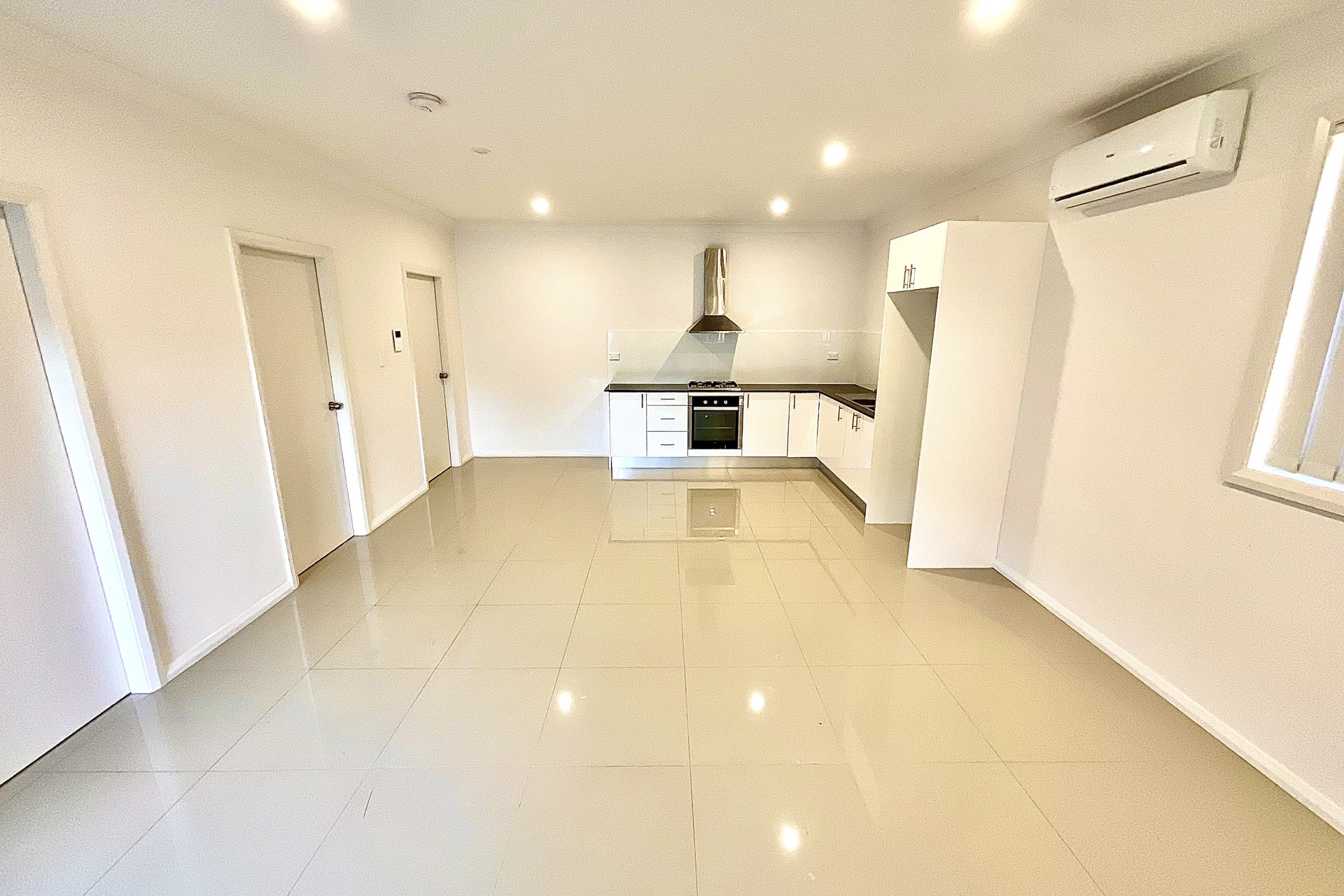 – Open plan lounge and dining room with split system air conditioner